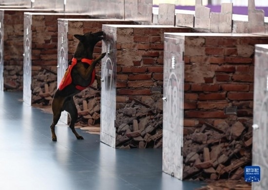 11月8日,搜救犬訓導員和搜救犬在比賽中。