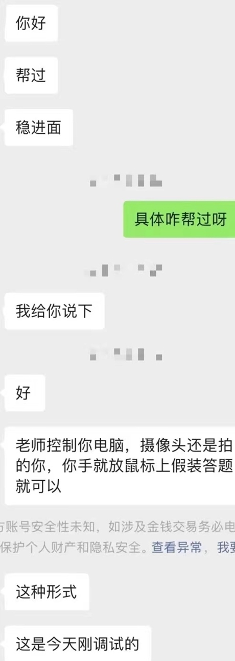 “老師(遠程)控制你的電腦,你手放在鼠標上假裝答題就可以?!?/p>