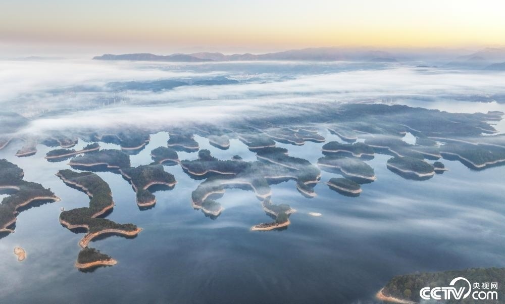 杭州淳安縣千島湖鎮(zhèn)上空出現(xiàn)平流霧景象,云霧繚繞,猶如人間仙境。