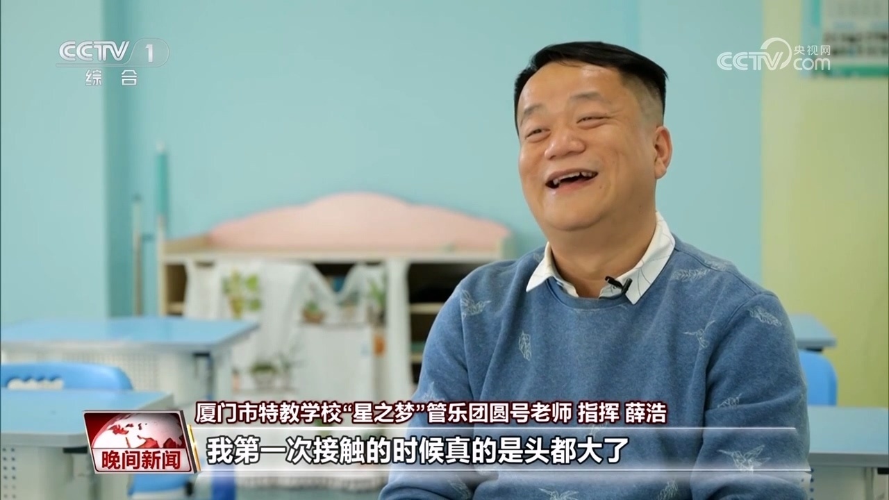 廈門市特教學?!靶侵畨簟惫軜穲F圓號老師 指揮 薛浩:我們學了這么多年了,第一次(專場音樂會),一定要加油。