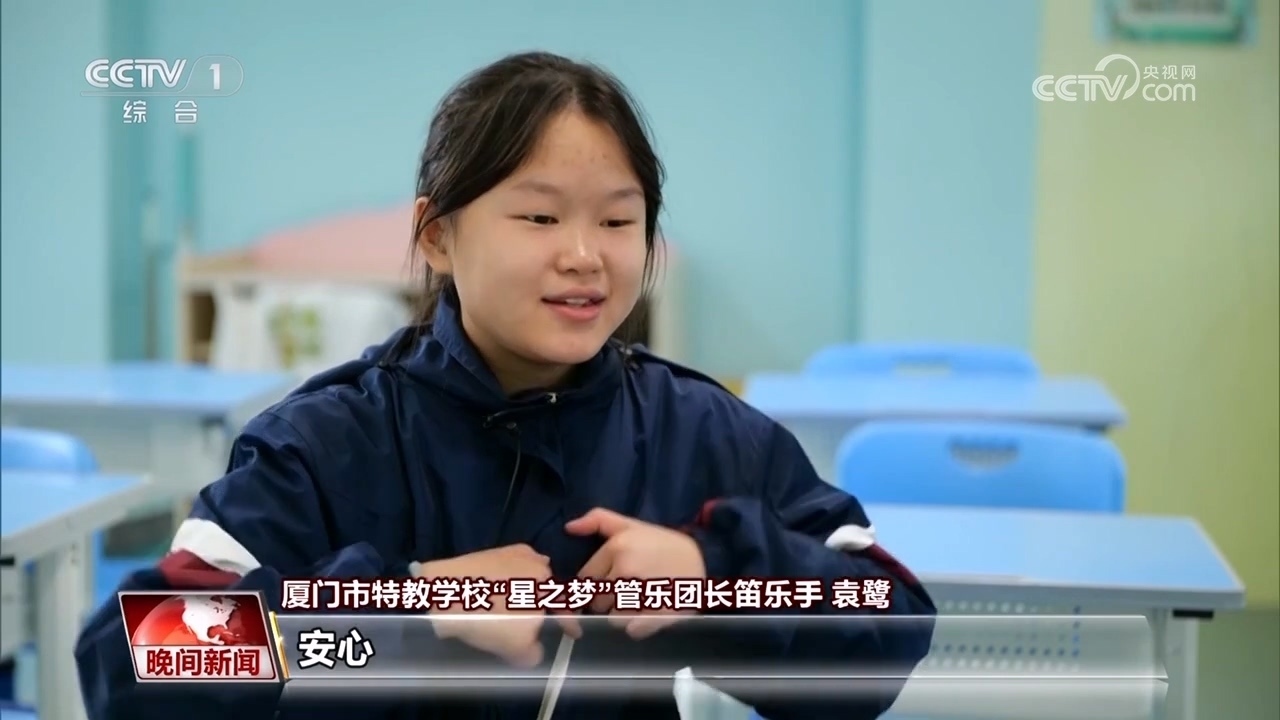 廈門市特教學?!靶侵畨簟惫軜穲F長笛 袁鷺:我跟不上他們,然后老師肩膀拍我才可以跟得上。