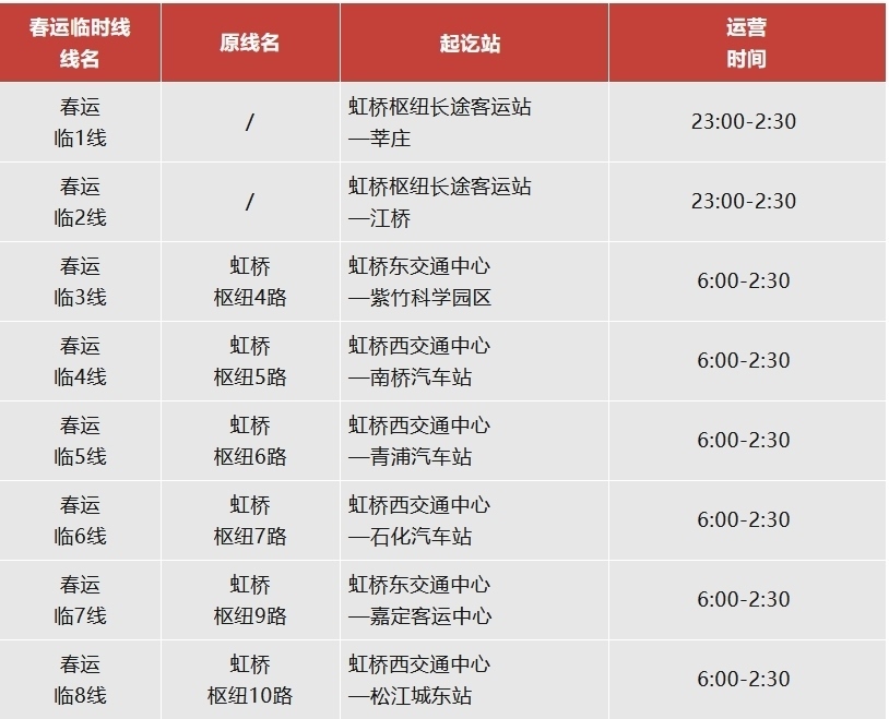 注:虹橋樞紐春運臨時專線運營日期為2月14日至2月23日。