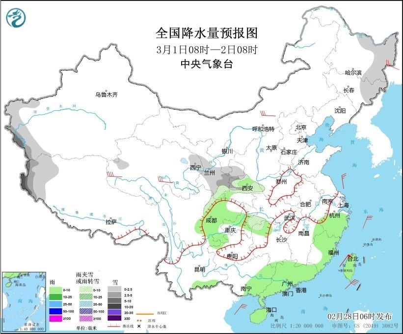 2月28日08時(shí)至29日08時(shí),內(nèi)蒙古東北部、東北地區(qū)、西藏東部、西北地區(qū)中東部、川西高原北部、山西南部等地部分地區(qū)有小到中雪或雨夾雪,其中,甘肅河西和東部等地部分地區(qū)有大雪(5~9毫米)。江淮大部、江漢大部、江南、西南地區(qū)東部、華南大部等地部分地區(qū)有小到中雨,其中,湖南中南部、江西中部、廣西東北部等地部分地區(qū)有大雨(25~35毫米)。西藏北部、青海西部等地部分地區(qū)有5~6級(jí)風(fēng)。