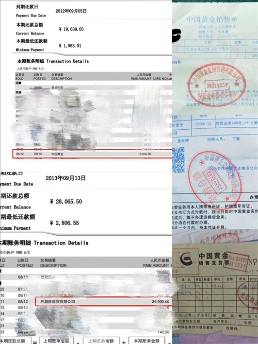 王鑫民:09年時(shí)候,他們跟順義那邊就有一個(gè)中國黃金店,就賣投資的黃金。我們想說買點(diǎn),將來自個(gè)老了以后能有一保證。他說,你要能寄存到這兒,還能給你點(diǎn)小禮品,我們想挺好的,你擱家多不安全,這么貴重的東西,我們就擱他那了,他給我們開單子。后來,順義這店搬到雙井去了,這是中國黃金的,而且商場更大,誰不都得放心。我們想跟他們也熟了,每年有點(diǎn)兒錢就買一點(diǎn)兒,還安全,還有點(diǎn)小獎(jiǎng)品,左一回買右一回買的,他店員都認(rèn)得我們了,挺熟的。他突然給我們打電話說:這出事了,你們趕緊過來。