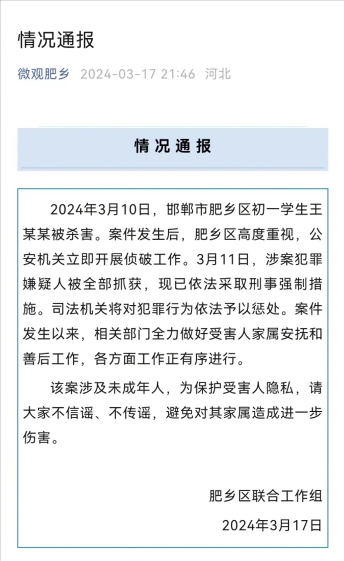 ·河北邯鄲通報初中生被殺害案:嫌疑人全部抓獲。