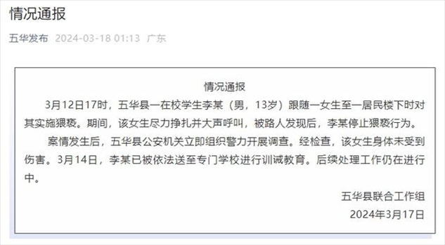 ·13歲在校男生跟隨女生實施猥褻?廣東梅州五華縣通報。