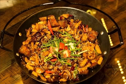 到了張家界,“三下鍋”不得不嘗?!叭洛仭笔侵胳趟⒊粗?、燉煮等三道工序。它將臘肉、豆腐、蘿卜等葷素食材一鍋燉,味道香濃,是土家族的傳統(tǒng)菜肴之一。