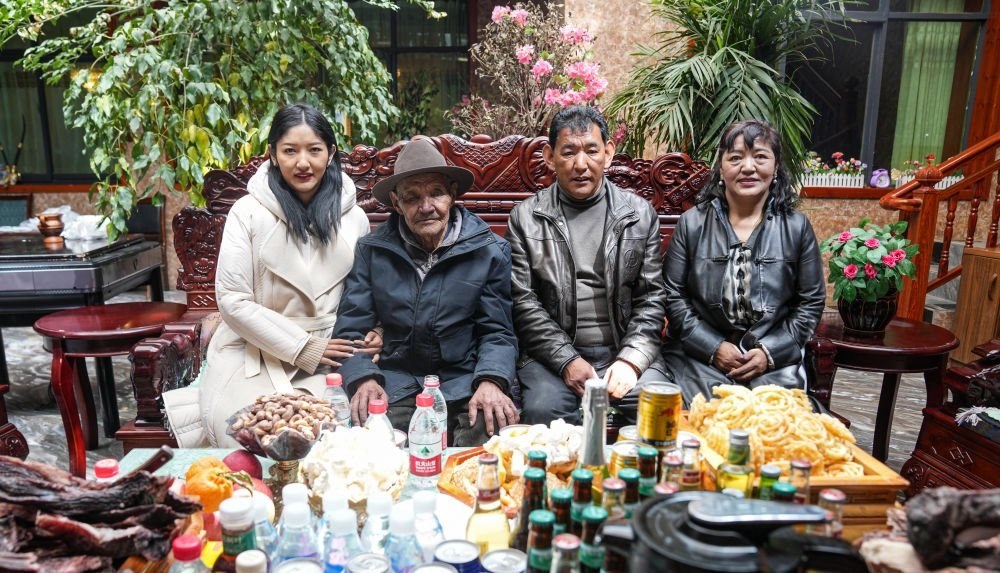 孫女索朗曲珍、朗杰(左二)、二兒子尼瑪和二兒媳次旦卓嘎在家中合影(3月13日攝)。新華社記者 晉美多吉 攝