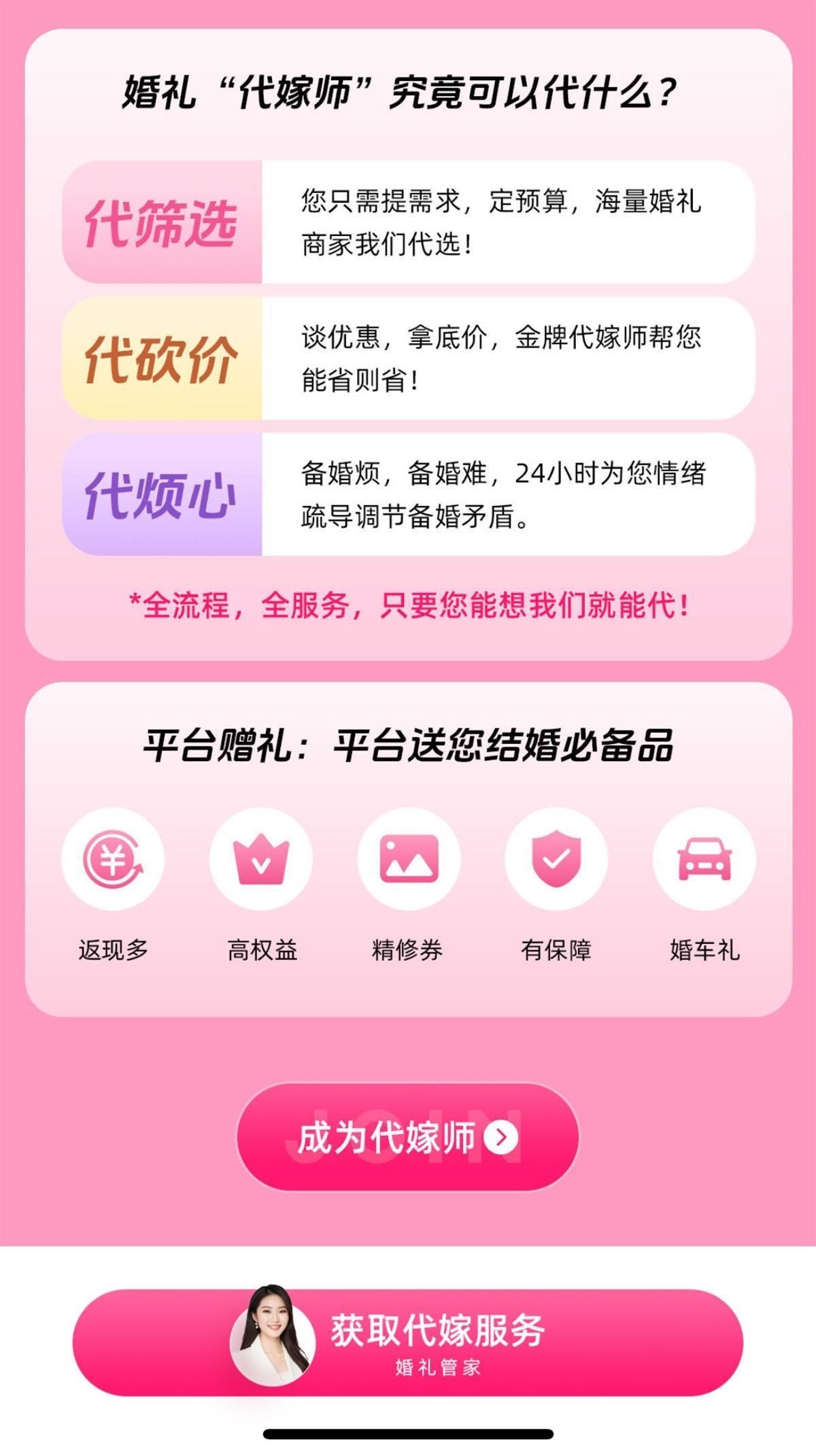 該頁(yè)面還宣傳稱,代嫁師可以“代篩選”“代砍價(jià)”“代煩心”,并且還有一行字強(qiáng)調(diào):“全流程,全服務(wù),只要您能想,代嫁師就能代?!?/p>