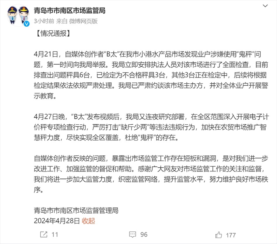 青島市市南區(qū)市場監(jiān)督管理局安排執(zhí)法人員對該市場進行了全面檢查,目前排查出問題秤具6臺,已檢定為不合格秤具3臺,其他3臺正在檢定中,后續(xù)將根據(jù)檢定結(jié)果依法依規(guī)嚴肅處理。