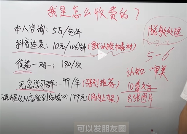 此外,不少婚戀軍師都公開了聯(lián)系方式,通過提供一對(duì)一指導(dǎo)、付費(fèi)視頻、情感課程、收徒、經(jīng)營朋友圈教學(xué)等形式斂金,且價(jià)格不菲。