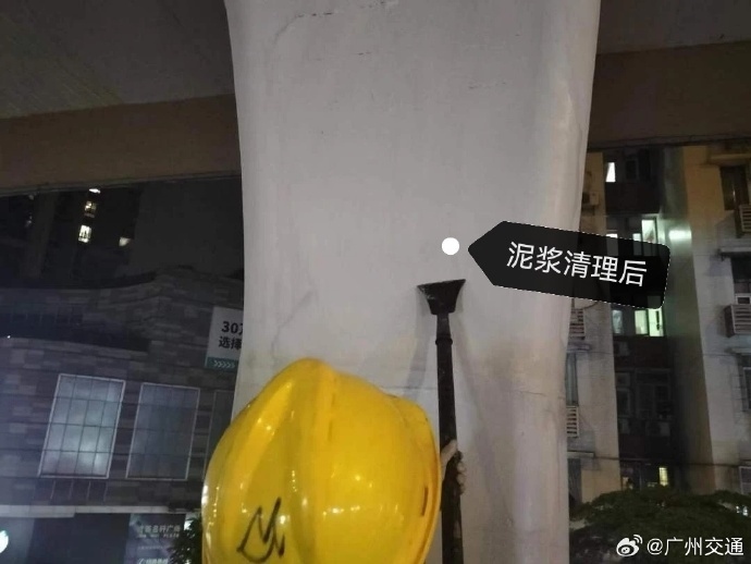廣州市道路事務中心現(xiàn)場核實,照片中的“裂縫”為泥漿污漬,現(xiàn)已完成污漬鏟除和涂裝翻新。
