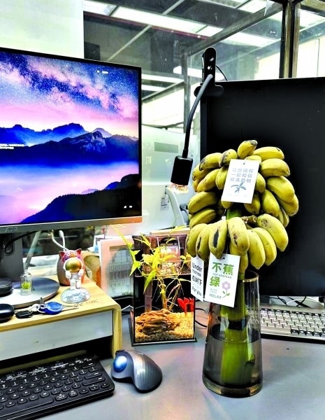 “現(xiàn)在大家工作都挺累的,職場里稍微有一點(diǎn)令人感到驚喜和有趣的話題,大家好像就會變得很開心?!眳芹谑且幻来畈┲?,自從他開始在辦公桌上養(yǎng)香蕉之后,單位的很多同事都會好奇地走過來瞧瞧。