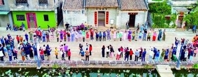 在青田,藝術(shù)讓這個村落慢慢蘇醒,也讓青田人對家鄉(xiāng)充滿驕傲與自豪。除了青田水鄉(xiāng)藝術(shù)季、“上善若水——藝術(shù)龍舟行動”等活動,一場“走田”主題時裝秀,更是點燃了村民的熱情。穿著設(shè)計師以鄉(xiāng)村生產(chǎn)生活為靈感設(shè)計的服裝,佩戴著自己親手制作的香云紗配飾,道具是平日田間勞作的老物什,村民“模特”們雖面露羞澀,但走在自己最熟悉的鄉(xiāng)野,走出的是自信、堅定的步伐,仿佛在告訴每一個人,這就是我們的生活,我們的時尚。