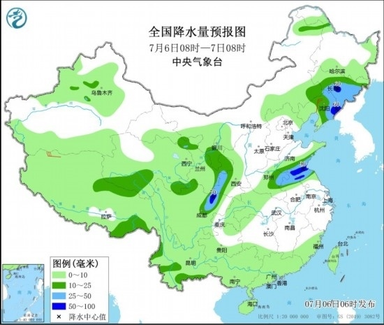 7月6日08時至7日08時,內蒙古東南部、東北地區(qū)中東部和西部、西藏北部和東南部、青海南部、西北地區(qū)東北部、黃淮東部和西部、江淮東部和西部、四川盆地西北部、云南西南部等地部分地區(qū)有中到大雨,其中,吉林中東部、遼寧東部、山東南部、江蘇北部、四川盆地西北部等地部分地區(qū)有暴雨(50~90毫米)。遼寧中部、西藏西部等地部分地區(qū)有4~6級風。