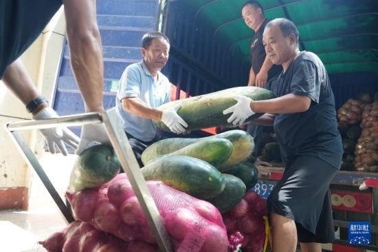 7月7日,工作人員在華容縣職業(yè)中專安置點(diǎn)搬運(yùn)社會捐贈(zèng)的農(nóng)產(chǎn)品。