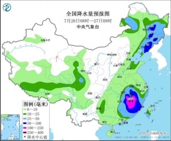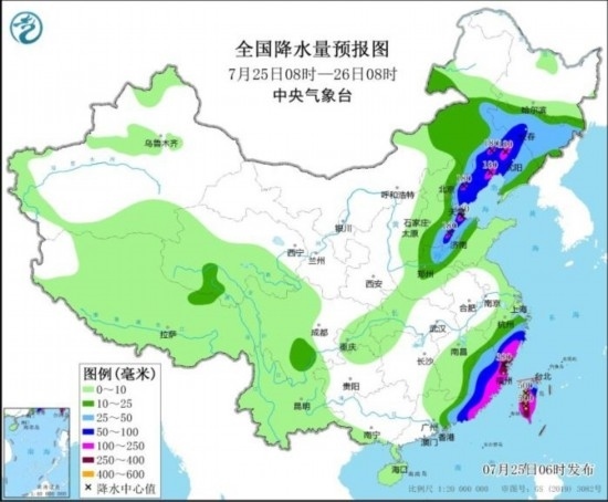 全國降水量預(yù)報圖(7月25日08時-26日08時)