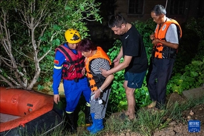 凌晨2時許,記者在決口現(xiàn)場看到,由于道路狹窄,通行不便,消防隊員扛著救生艇向受災區(qū)域挺進,不斷有受災群眾乘坐救生艇被轉移至安全地帶。