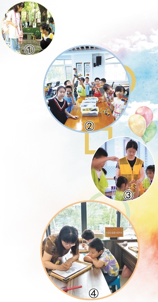 圖①:廣東省佛山市高明區(qū)組織孩子們到森林公園游覽,將研學(xué)實(shí)踐融入暑期托管。賀林平 劉鳳平攝影報(bào)道圖②:吉林省長(zhǎng)春市義和社區(qū)暑期托管班里,孩子們?cè)谡故臼止ぷ髌贰3?玥攝 圖③:湖北省武漢市一個(gè)寫字樓里的暑期托管班,志愿者在照看孩子。共青團(tuán)武漢市武昌區(qū)委供圖 圖④:江蘇省宜興市振興社區(qū)暑期托管班里,老師給孩子們示范手工刻紙。趙 霞攝