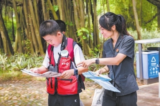 圖①:干警指引學生們觀察稀有鳥類。