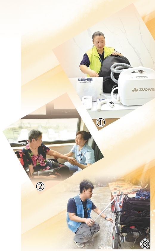 圖①:老年助浴員肖琳在店里收拾設(shè)備,準(zhǔn)備上門為老人助浴。冷智梅攝 圖②:健康照護師劉馳在為耿守愛老人進行護理。本報記者 朱佩嫻攝 圖③:適老化改造評估師鐘晉軒在測量曾炳成老人的輪椅扶手高度。本報記者 洪秋婷攝