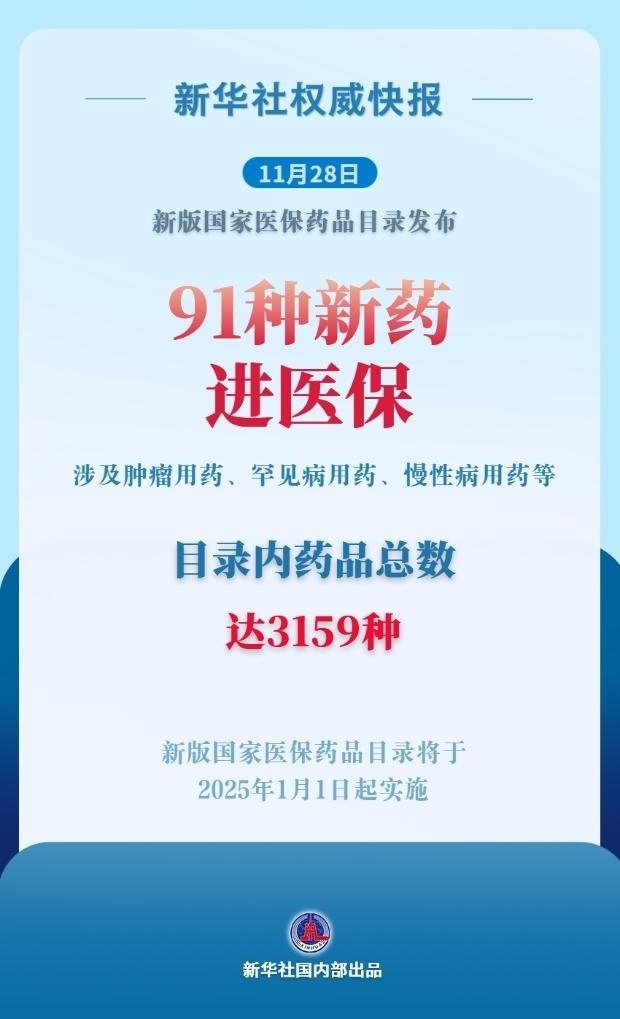 國家醫(yī)保局11月28日召開新聞發(fā)布會,發(fā)布新版國家醫(yī)保藥品目錄調(diào)整情況。本次調(diào)整共新增91種藥品,包括腫瘤用藥、糖尿病等慢性病用藥、罕見病用藥、抗感染用藥、中成藥、精神病用藥等。同時,調(diào)出43種臨床已替代或長期未生產(chǎn)供應(yīng)的藥品。