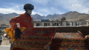 在定日縣措果鄉(xiāng)野江村,消防員在活動板房上安置國旗(1月13日攝)。(新華社記者 丁增尼達(dá) 攝)