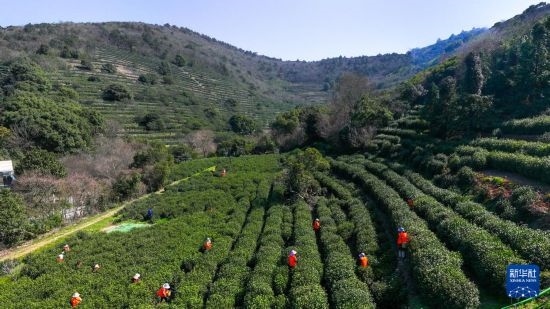 3月17日,在蘇州市吳中區(qū)西山國(guó)家現(xiàn)代農(nóng)業(yè)示范園金海華碧水緣茶葉基地,采茶工在碧螺春古茶園采茶(無人機(jī)照片)。