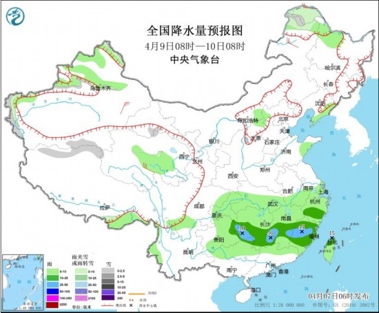 4月9日08時(shí)至10日08時(shí),內(nèi)蒙古東部、新疆南疆西部山區(qū)有小到中雪或雨夾雪,貴州東部、湖南中南部、江西中南部、浙江南部、福建、臺灣島中北部等地有中到大雨(25~45毫米)。內(nèi)蒙古中部和東部、陜西中北部、山西部分地區(qū)有4~6級風(fēng),陣風(fēng)7級。