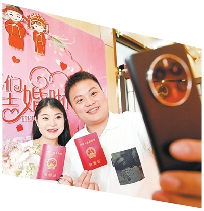 一對新人在河北邯鄲峰峰礦區(qū)婚姻登記服務(wù)中心自拍留念。