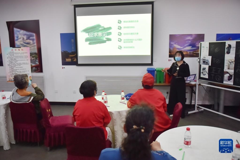 在北京建國(guó)門(mén)街道趙家樓社區(qū)議事廳舉行的“兩桶一袋”居民征求意見(jiàn)懇談會(huì)上,來(lái)自社區(qū)的12位垃圾分類達(dá)人對(duì)“兩桶”款式進(jìn)行投票選擇,同時(shí),街道針對(duì)桶站位置、定時(shí)定點(diǎn)投放等垃圾分類運(yùn)營(yíng)管理聽(tīng)取居民意見(jiàn)(2020年5月2日攝)。新華社記者彭子洋攝