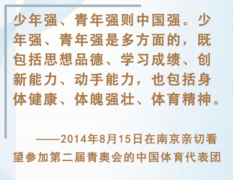 青少年是祖國(guó)的未來、民族的希望。強(qiáng)健的體魄是青少年成長(zhǎng)成才的重要前提。對(duì)加強(qiáng)體育教育,增強(qiáng)青少年體質(zhì),習(xí)近平總書記念茲在茲。