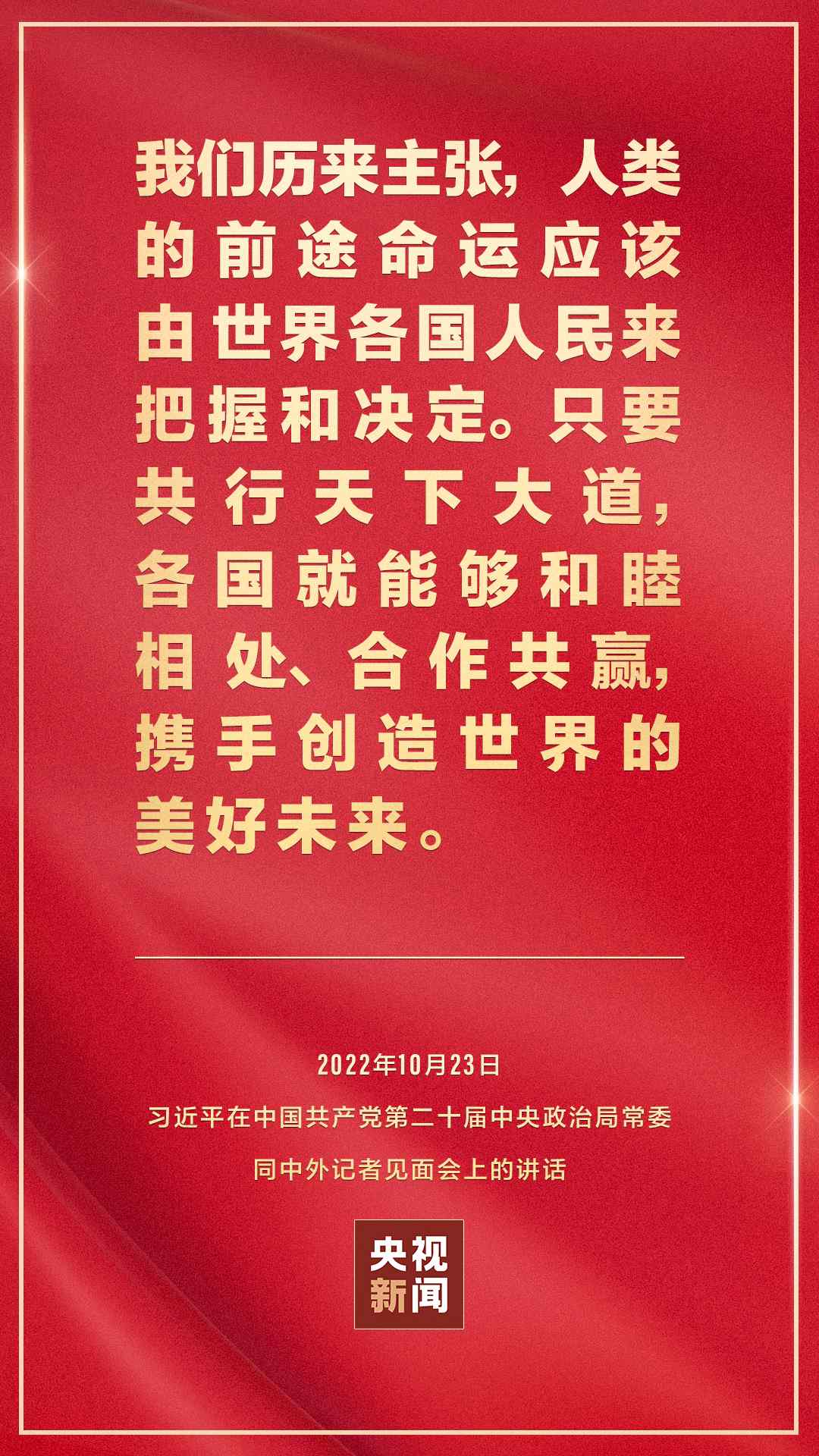 在中國共產(chǎn)黨第二十屆中央委員會第一次全體會議上當(dāng)選的中共中央總書記習(xí)近平和中共中央政治局常委李強(qiáng)、趙樂際、王滬寧、蔡奇、丁薛祥、李希,23日中午在人民大會堂同采訪中共二十大的中外記者見面。習(xí)近平發(fā)表重要講話。