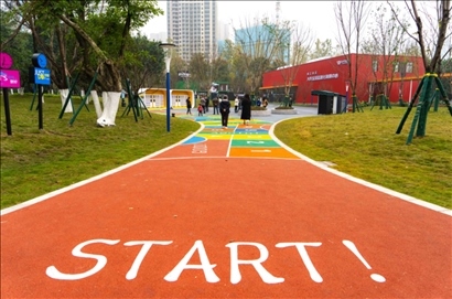 △重慶兩江新區(qū)生活垃圾分類主題公園分類知識(shí)通關(guān)步道。該形式在寓教于樂(lè)中推廣垃圾分類知識(shí)。