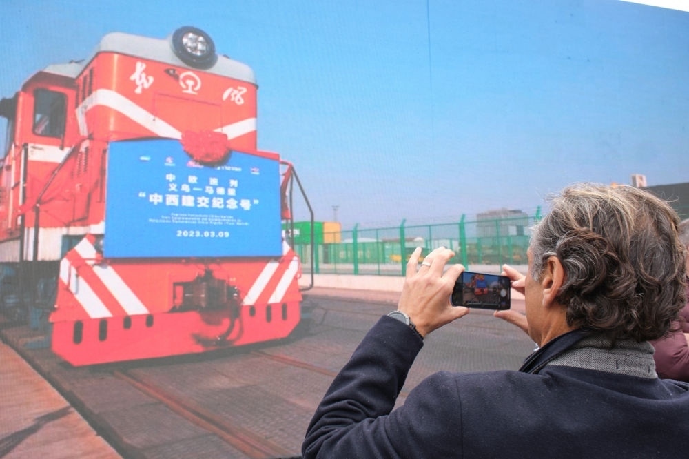 2023年3月9日,一列裝載著小商品、電子產(chǎn)品、日用百貨等貨物的“中西建交紀(jì)念號(hào)”中歐班列從浙江義烏鐵路西站奔赴西班牙首都馬德里。一列裝載著紅酒、橄欖油等西班牙特色產(chǎn)品的班列也從馬德里出發(fā),相向而行,駛向義烏。