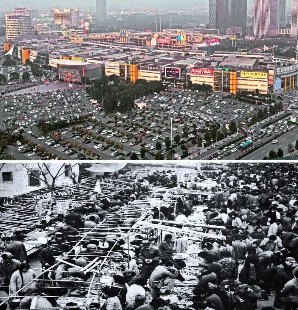 2018年拍攝的義烏國(guó)際商貿(mào)城一區(qū)市場(chǎng)(上)和1982年9月開(kāi)業(yè)的義烏第一代小商品市場(chǎng)(下)。