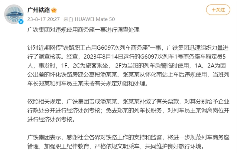·廣鐵集團回應(yīng)職工占用高鐵商務(wù)座:2人補繳車票,列車長免職。