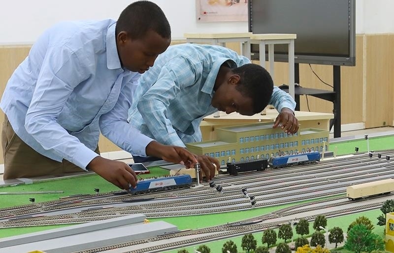 △2022年9月19日,在位于吉布提首都吉布提市的吉布提工商學(xué)校,學(xué)生在魯班工坊鐵道運(yùn)營(yíng)沙盤教學(xué)區(qū)學(xué)習(xí)。