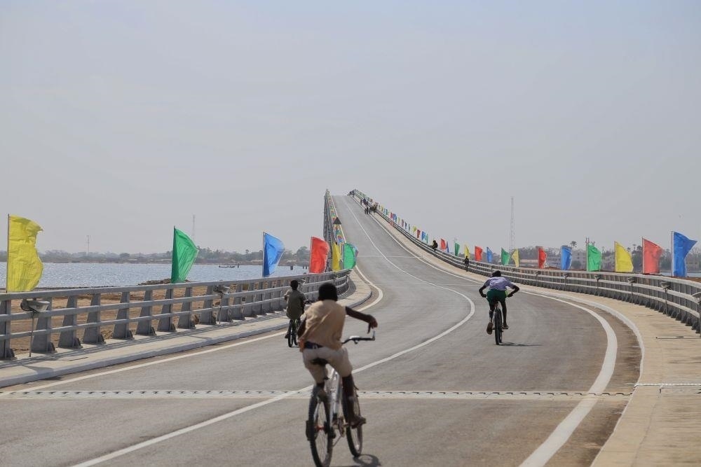 △2022年1月16日,人們騎車通過位于塞內(nèi)加爾方久尼市、由中國(guó)公司承建的方久尼大橋。