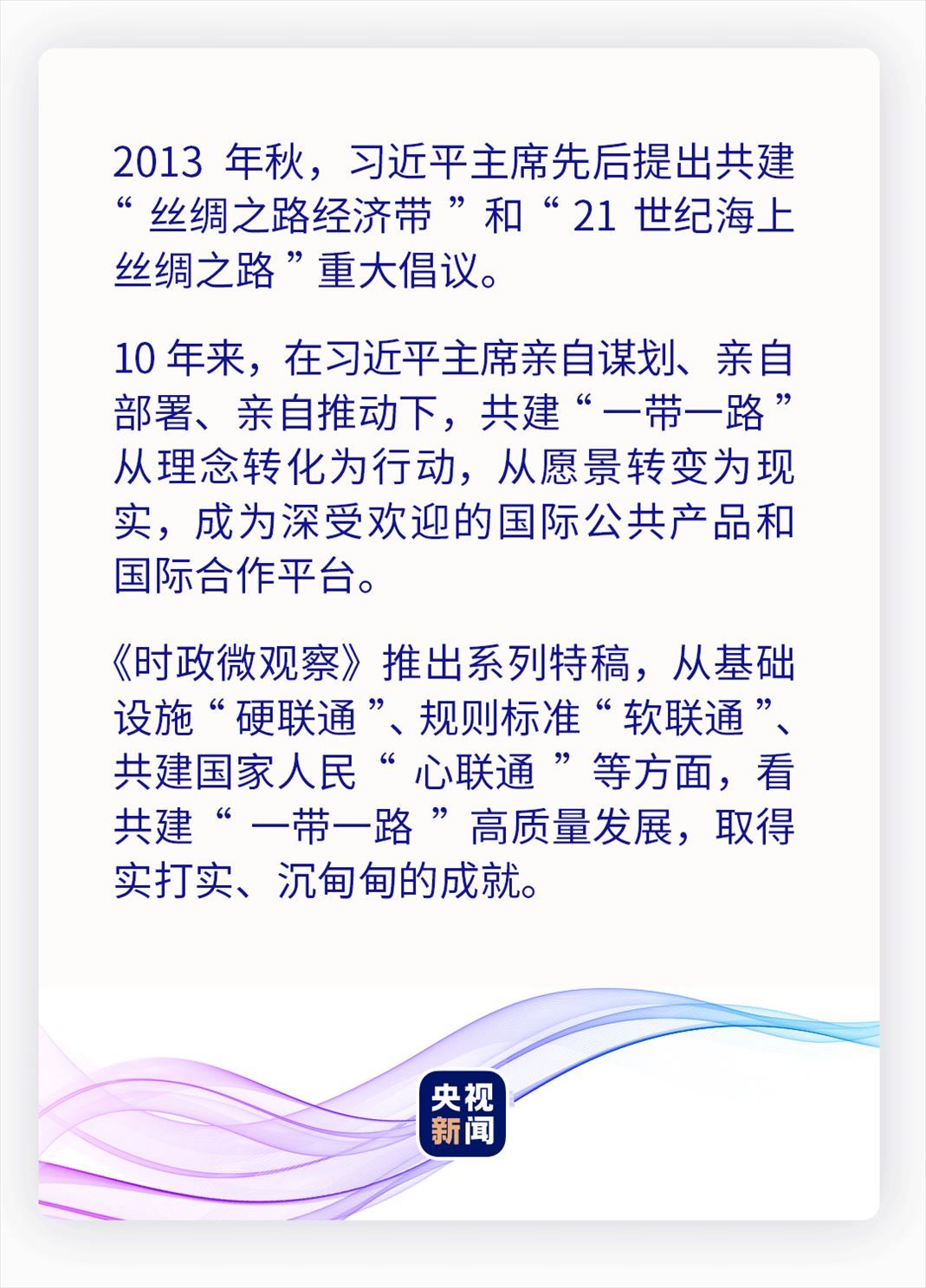 10年來,中國與共建國家以基礎(chǔ)設(shè)施“硬聯(lián)通”為重要方向,攜手前行。在“鋼鐵駝隊”的汽笛聲里、在跨海大橋上的車流中、在“空中絲綢之路”的萬米高空、在“數(shù)字絲綢之路”的“云端”……一條條幸福路、繁榮路,鋪就一幅共建“一帶一路”的壯闊畫卷。