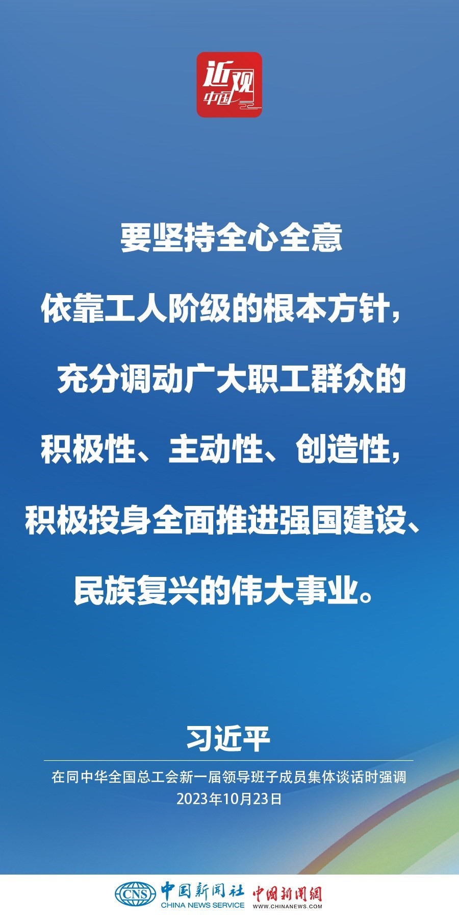 中共中央總書記、國家主席、中央軍委主席習(xí)近平23日下午在中南海同中華全國總工會新一屆領(lǐng)導(dǎo)班子成員集體談話并發(fā)表重要講話。他強(qiáng)調(diào)——