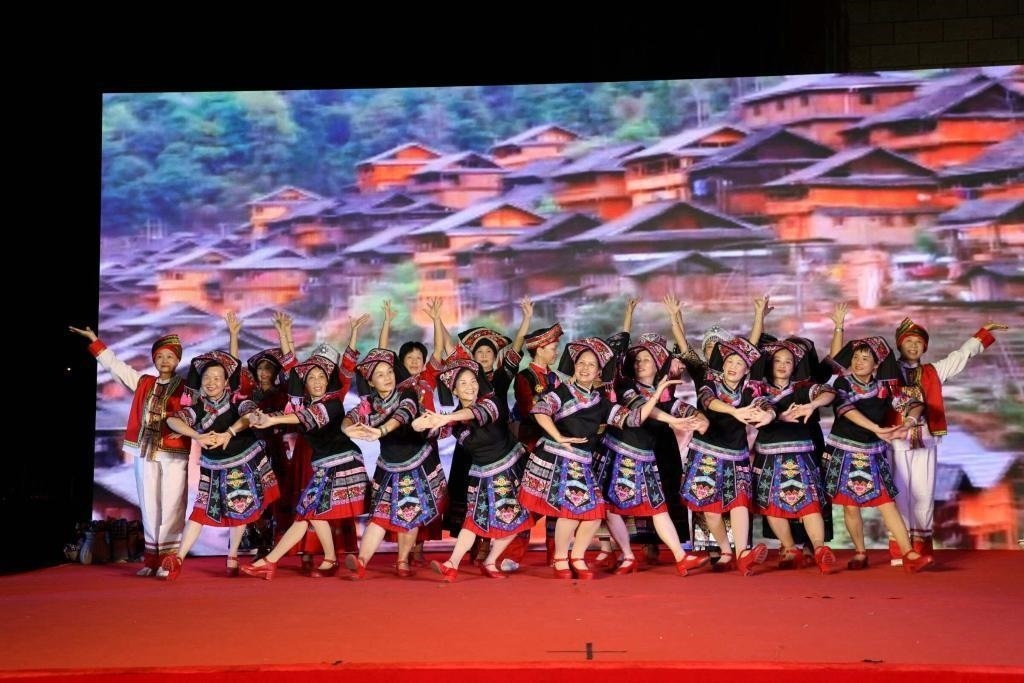 △2023年9月30日,廣西南寧市蟠龍社區(qū)舉辦的國(guó)慶節(jié)晚會(huì),居民們?cè)诒硌菝褡逦璧浮?/span>