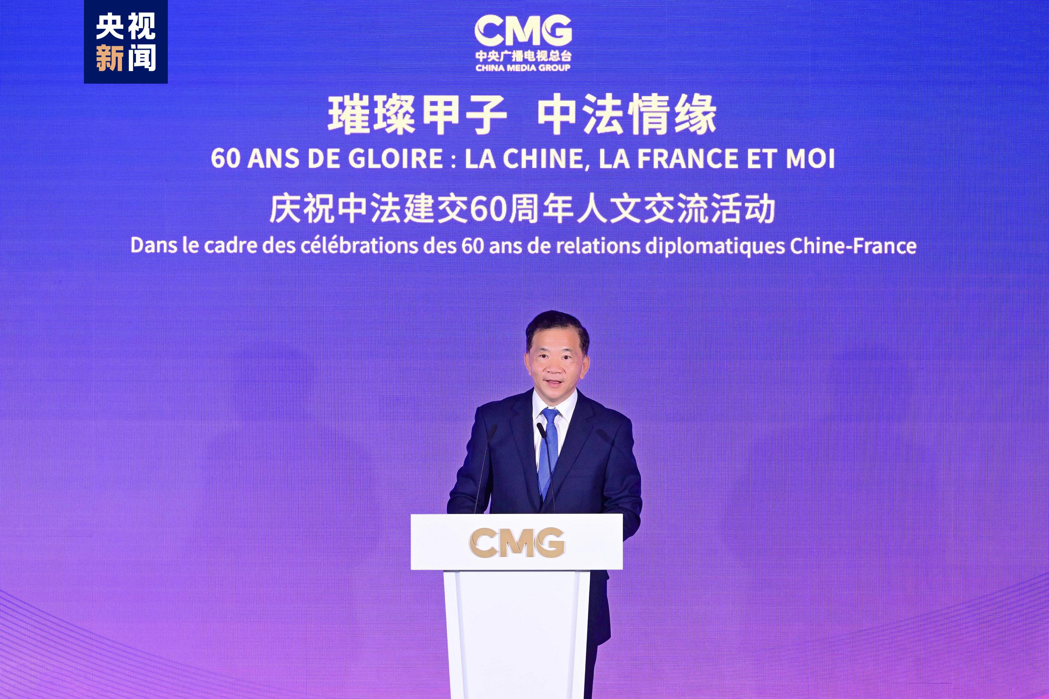 慎海雄表示,習(xí)近平主席指出,敢為人先、與時(shí)俱進(jìn)是中法關(guān)系始終走在中國同西方國家關(guān)系前列的重要法寶。法國是具有獨(dú)立見解、獨(dú)特個(gè)性的西方大國,不僅因其經(jīng)濟(jì)實(shí)力,還因國家品質(zhì)和人民氣節(jié),贏得了中國人民的尊重。建交60年來,中法兩國的友誼之船在兩國元首把舵定向下行穩(wěn)致遠(yuǎn)。人文交流貴在思想、文化的交匯、碰撞和吸引。中央廣播電視總臺(tái)精品節(jié)目《平“語”近人——習(xí)近平喜歡的典故》(國際版)在法國播出,為大家讀懂習(xí)主席的思想、中國文化、中國智慧打開一扇思想之窗,邀大家共賞璀璨輝煌的中華文明和新時(shí)代中國的獨(dú)特魅力。站在中法建交一甲子的歷史節(jié)點(diǎn),總臺(tái)愿與法國朋友們并肩同行,為打造更加牢固、更富活力的中法全面戰(zhàn)略伙伴關(guān)系、推動(dòng)構(gòu)建人類命運(yùn)共同體貢獻(xiàn)智慧和力量。