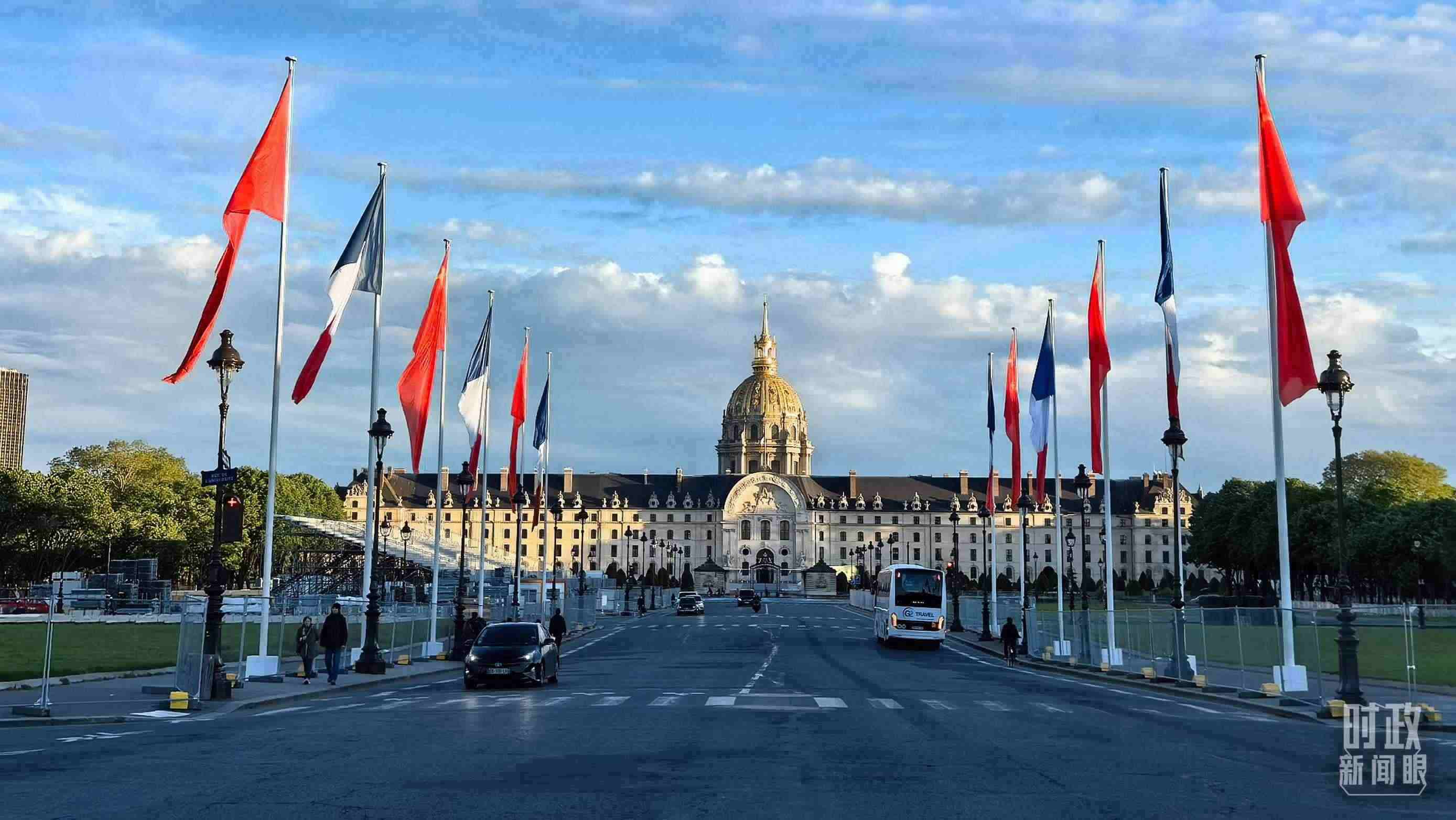 △法國巴黎榮軍院前懸掛中法兩國國旗。(總臺國廣記者吳倩拍攝)