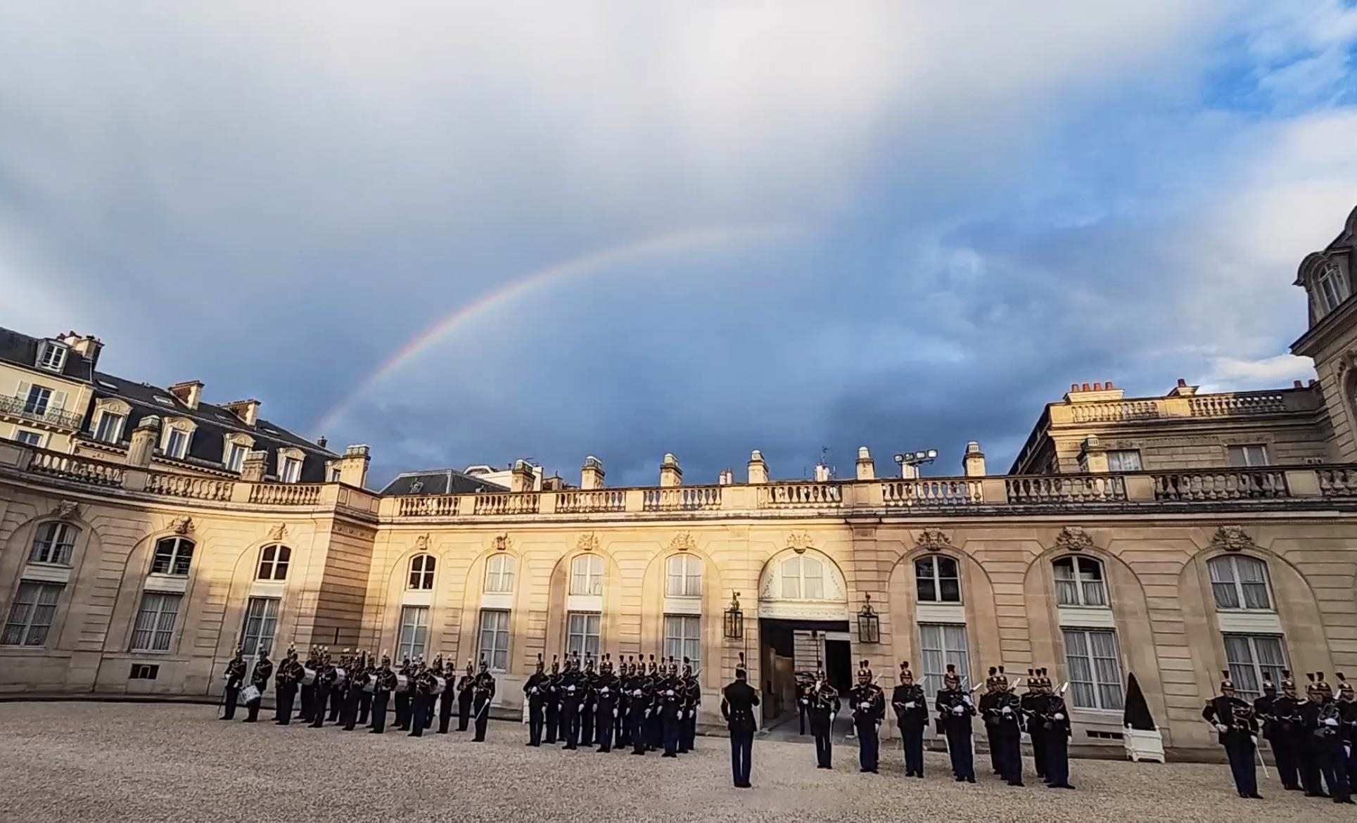 當(dāng)?shù)貢r間5月6日晚,習(xí)近平主席在巴黎出席馬克龍總統(tǒng)舉行的盛大歡迎宴會。宴會前,愛麗舍宮上空出現(xiàn)彩虹。彩虹連接著東西方。塞納河畔,正寫下中法兩國“雙向奔赴”的新故事。
