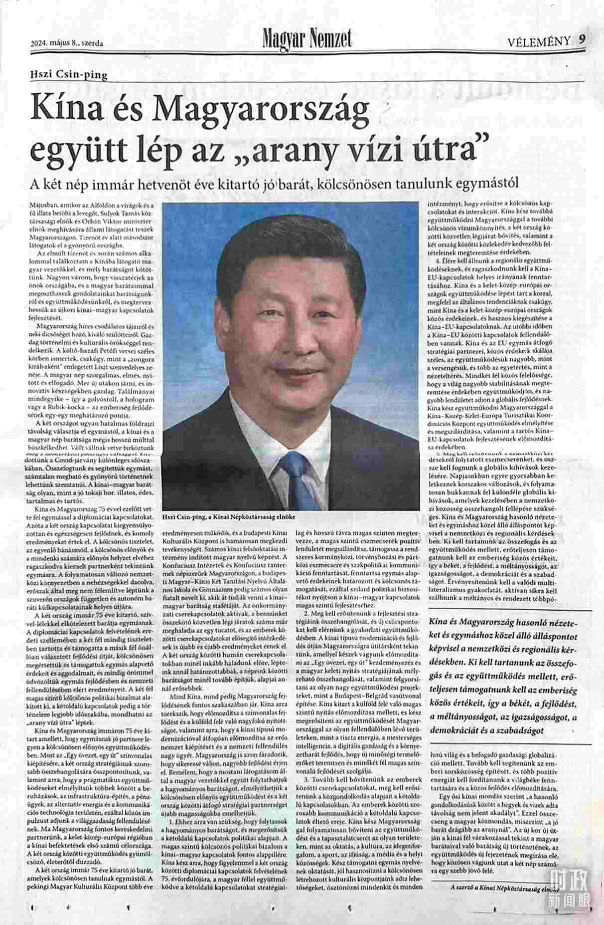 △習(xí)主席在匈牙利《匈牙利民族報(bào)》發(fā)表的署名文章。(總臺(tái)記者沃龍拍攝)