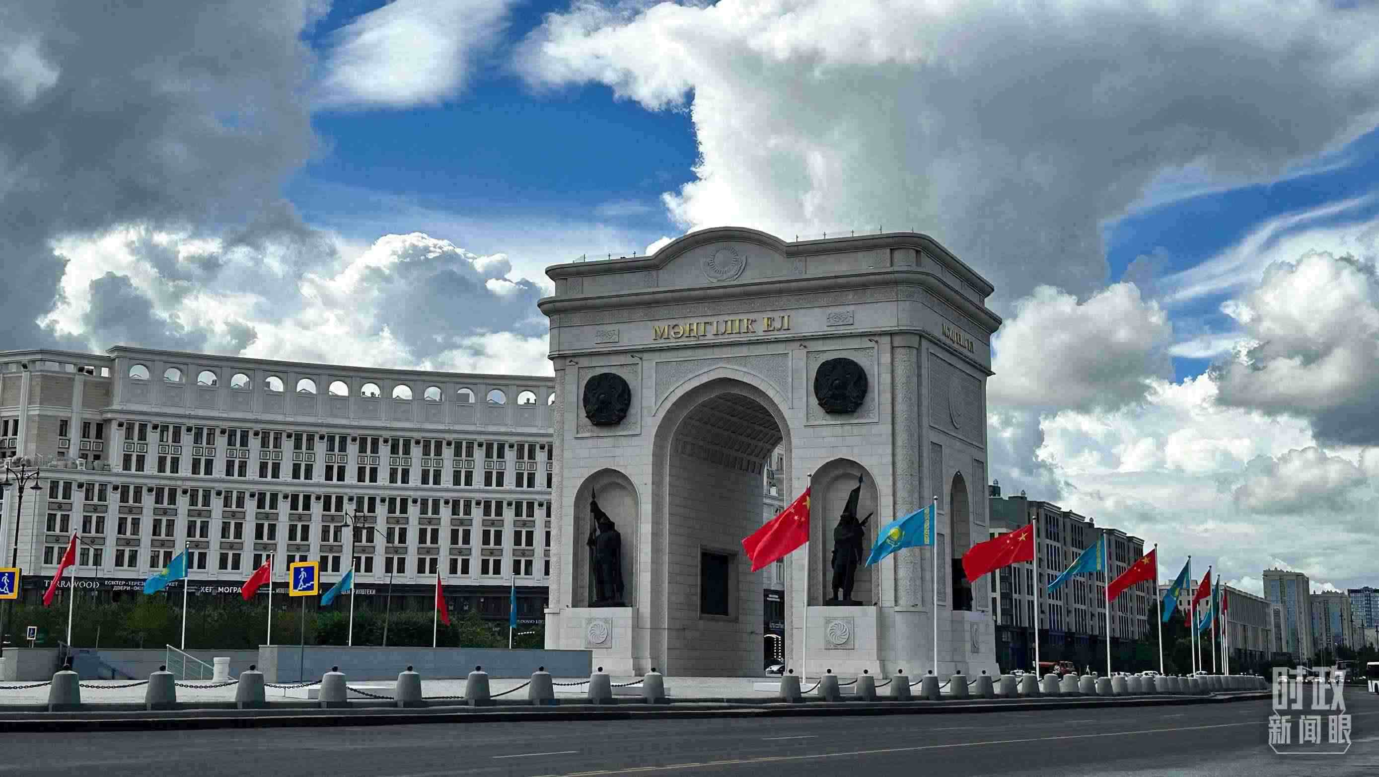 △阿斯塔納地標建筑“凱旋門”兩側(cè),中哈兩國國旗迎風招展。(總臺央視記者關(guān)舟拍攝)