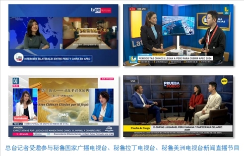 中央廣播電視總臺記者受邀參與秘魯國家廣播電視臺、秘魯拉丁電視臺和當?shù)厥找暵首罡叩拿佤斆乐揠娨暸_新聞直播節(jié)目,介紹《平“語”近人——習近平喜歡的典故》第三季(西班牙語版)內(nèi)容,帶領(lǐng)當?shù)厥鼙姼形蛄暯街飨玫渲刑N含的中國智慧。