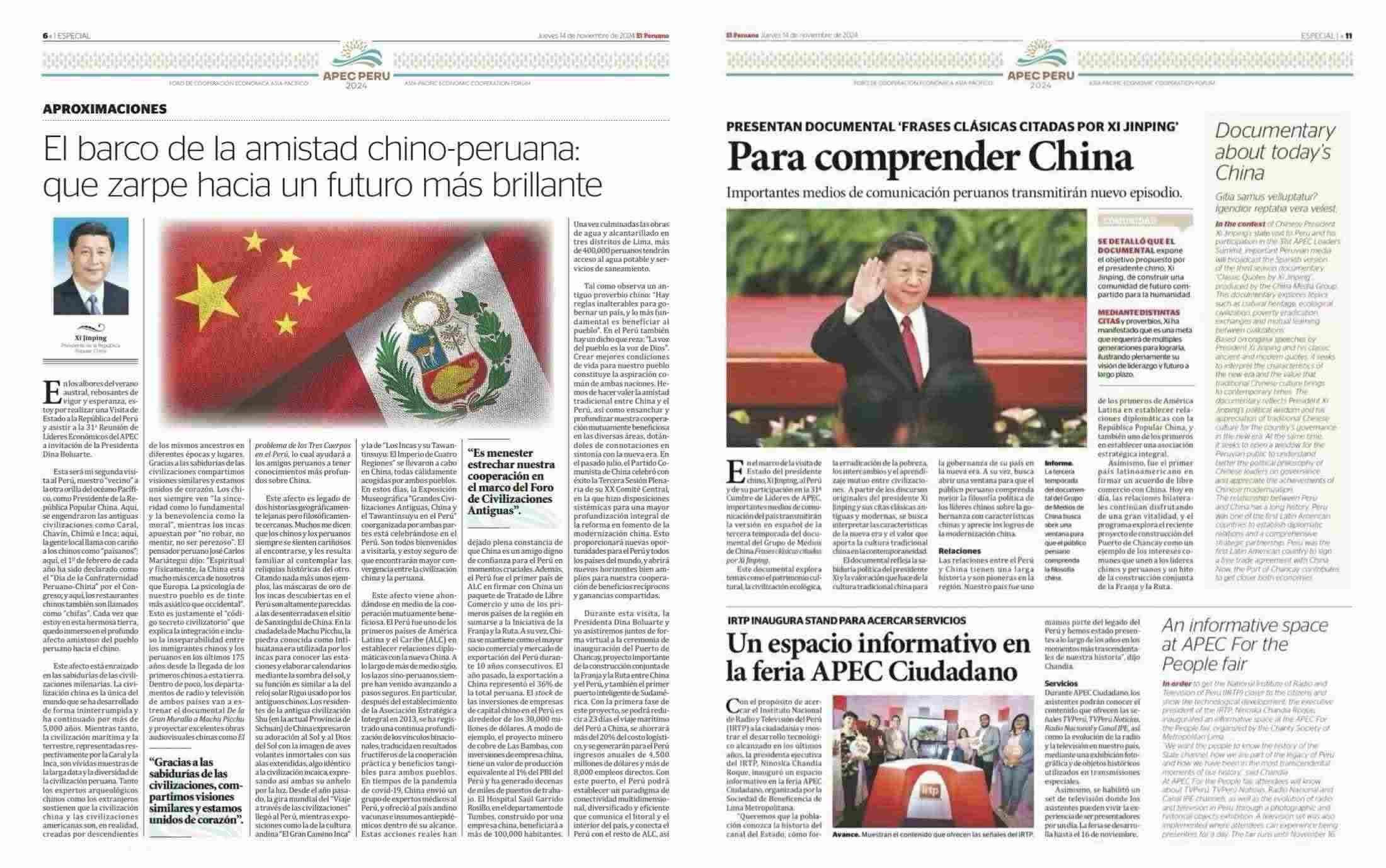 在中國國家主席習近平應秘魯共和國總統(tǒng)博魯阿爾特邀請,赴利馬出席亞太經(jīng)合組織第三十一次領(lǐng)導人非正式會議并對秘魯進行國事訪問之際,由中國中央廣播電視總臺制作的《平“語”近人——習近平喜歡的典故》第三季(西班牙語版),將于當?shù)貢r間11月14日起在秘魯國家廣播電視臺、秘魯電視聯(lián)播網(wǎng)、秘魯廣播節(jié)目集團電視端等多平臺落地播出。當?shù)囟嗉抑髁髅襟w對節(jié)目落播進行預告,引發(fā)秘魯各界普遍期待和廣泛關(guān)注。