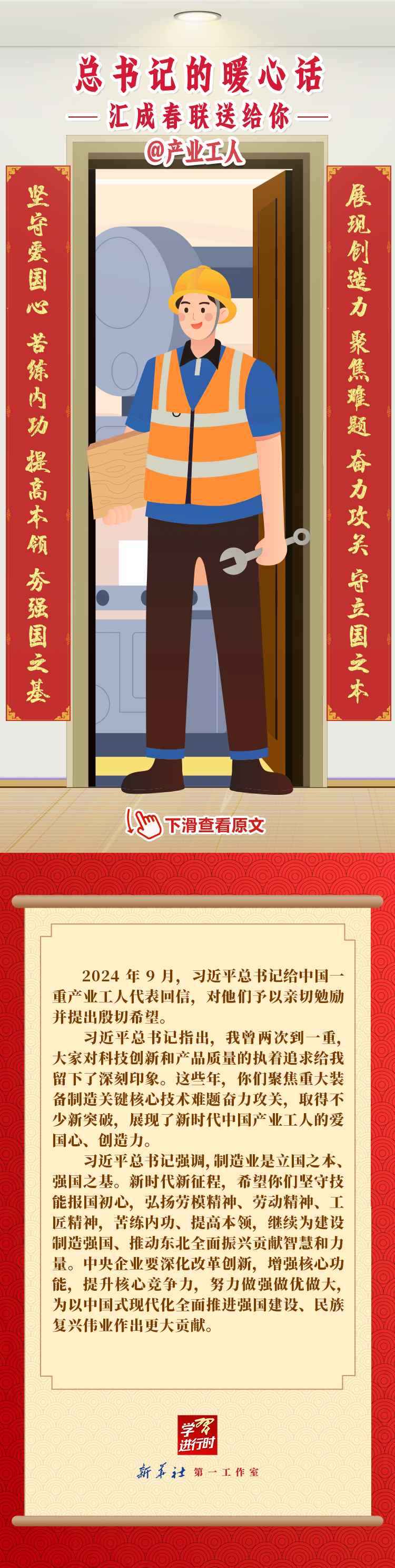 【學(xué)習(xí)進(jìn)行時(shí)】過(guò)春節(jié),貼春聯(lián),寄托人們對(duì)新年的美好愿望。過(guò)去一年,習(xí)近平總書記在不同場(chǎng)合點(diǎn)贊各行各業(yè)奮斗者,說(shuō)了許多暖心話。新春之際,我們匯編成聯(lián),向新征程上的每一位“主角”致敬,送上新春的祝福。